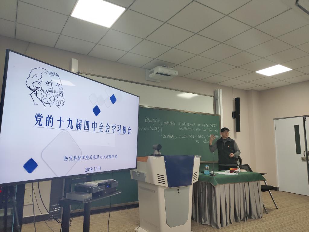 2019年11月21号下午2点至4点,beat365英国官方网站党总支书记李君,在承基楼512智慧教室,为beat365英国官方网站党总支、外国语学院党支部、基础部党支部全体党员主讲党的十九届四中全会精神党课。