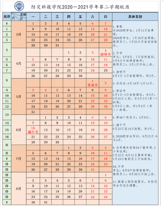 防灾科技学院2020—2021学年第二学期校历
