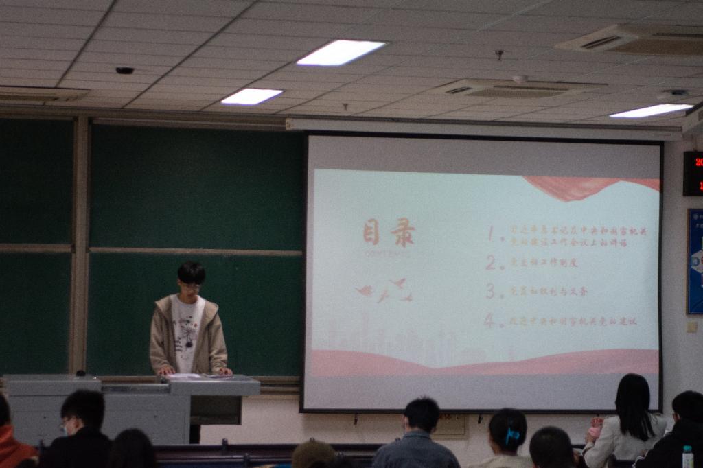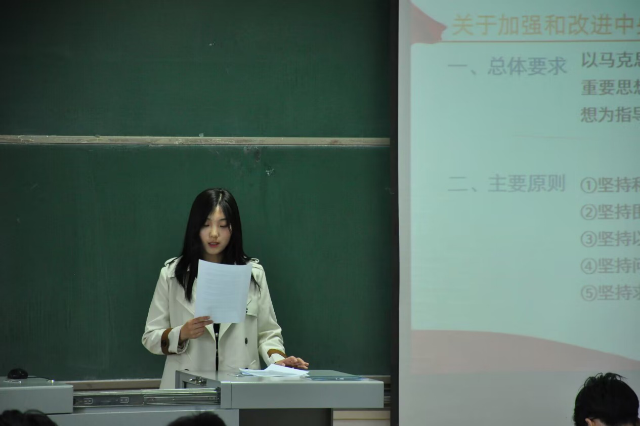 随后大学生政治研究协会会长张赛婵为同学们阐述了党支部工作制度即:1.党支部委员会工作制度2.党员大会议事制度。3.三会一课制度。4.发展党员制度。5.党费收缴制度。6.党员廉政及联系群众制度。7.民主评议党员制度。8.外出党员管理制度和党员的权利与义务以及改进中央和国家机关党的建议。参会的同学都认识到了我党的管理方式与行政制度,不少同学表示受益匪浅。