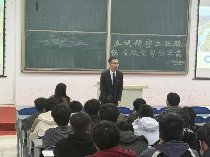 随后,立讯精密汪宝峰进一步补充介绍企业发展历程、核心业务领域及智能制造产业布局,重点分享企业在精密制造、自动化技术研发等方面的优势成果。同时对同学们关心的产业学院报名条件、课程设置与专业课程的衔接、企业实习的时间安排与安全保障、实习期间的补贴标准以及毕业后能否优先进入立讯精密核心技术部门工作等问题进行了耐心细致的解答。